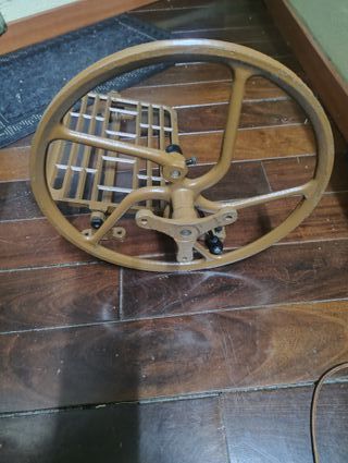 Conjunto de pedal y rueda para máquina de coser. - Pedal de metal con diseño de rejilla. - Rueda de gran tamaño en color marrón.