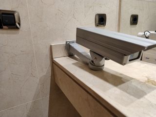 Trapecio de ayuda para la movilidad. Estructura metálica. Usado una única vez. - Diseñado para ayudar a las personas a sentarse y levantarse de la cama. - Tiene una base en forma de H para mayor estabilidad. - La base queda debajo de la cama para que no moleste. - Altura ajustable. - Asa triangular.