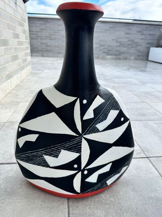 Jarrón de cerámica con un diseño abstracto y llamativo en blanco y negro, con detalles en rojo en la base y el cuello. - Diseño geométrico y orgánico. - Acabado mate. - Ideal como pieza decorativa.