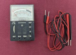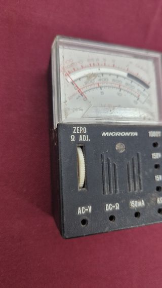 Multímetro analógico Micronta con puntas de prueba. - Modelo: 22-02 - Escalas: VΩ/mA, ACV, DCV, 150mA, KΩ - Incluye ajuste de cero para ohmios (Ω ADJ.) - Puntas de prueba rojas y negras incluidas.
