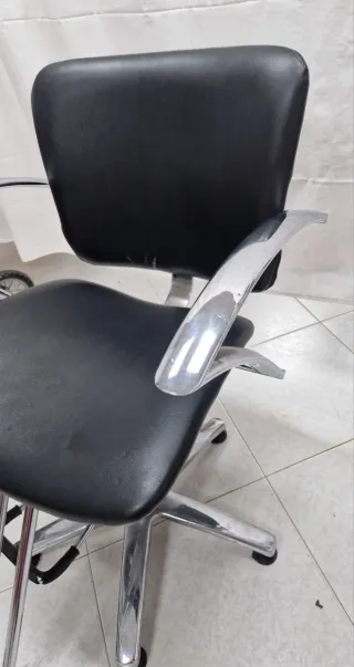 Sillón de peluquería con asiento y respaldo acolchados en color negro. Su diseño moderno y funcional lo hace ideal para salones de belleza. La función de subir a bajas no va muy bien. Mando video de su estado para mayor efectividad en el trato. A RECOGER EN LAREDO Medidas: Ancho 65cm Alto 61cm Largo 45c - Base cromada con ruedas. - Reposapiés metálico. - Altura regulable.