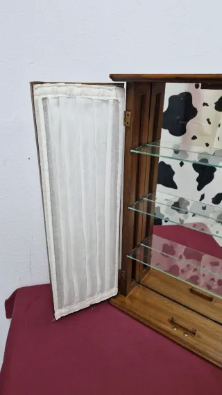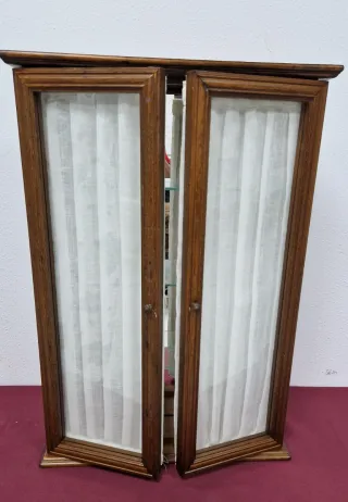 Vitrina de madera con un diseño elegante y funcional. Ideal para exhibir objetos decorativos o colecciones. Mando video de su estado para mayor efectividad en el trato. Medidas: Ancho 12cm Alto 61cm Largo 40cm - Estructura de madera oscura. - Dos puertas frontales con cristal. - Interior con baldas de cristal.