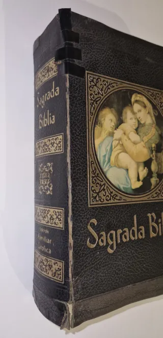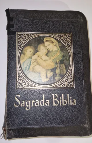 Biblia en tapa dura de color negro con detalles dorados. Salvo por un poco el costado esta en muy buen estado. El interior da gusto verlo. Mando video de su estado para mayor efectividad en el trato - Ilustración de la Virgen con el Niño. - Texto Sagrada Biblia en relieve.