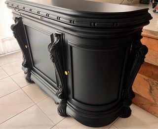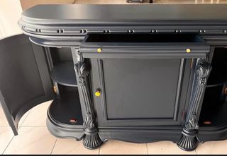Mueble de madera con un diseño clásico y elegante, perfecto para recibidores o salones. - Acabado en color azul oscuro. - Puertas abatibles y cajón. - Detalles ornamentales tallados. - Estantes interiores.