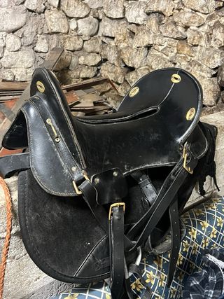 Silla de montura de estilo canadiense, elaborada en cuero negro. - Diseño clásico. - Hebillas y herrajes metálicos dorados. - Asiento acolchado. Con acciones nuevas