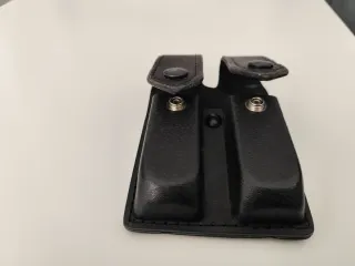 La funda porta cargador doble 77 tiene orientado el cargador con las balas hacia adelante (hacia fuerta). Tiene una tapa con botón clip de cierre.