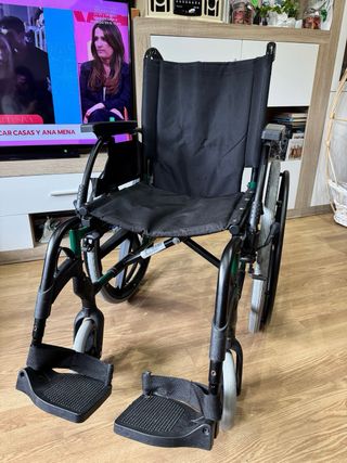 Silla de ruedas Breezy en color verde y negro. - Asiento y respaldo acolchados. - Ruedas grandes traseras y pequeñas delanteras. - Reposapiés ajustables.