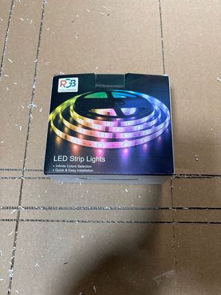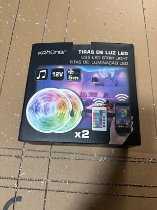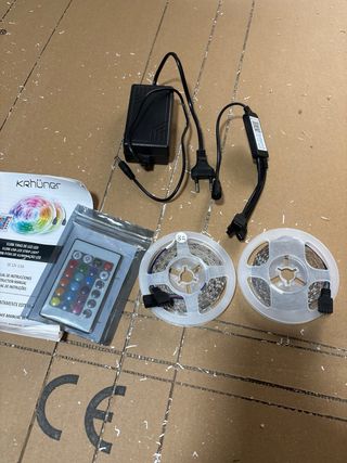 Kit de tiras LED RGB para iluminación decorativa. Incluye todo lo necesario para su instalación y control. - Dos rollos de tira LED. - Mando a distancia con múltiples colores y modos. - Adaptador de corriente. - Controlador LED.