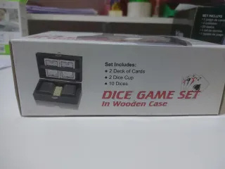 Set de juegos de dados de la marca Alex Bog, presentado en una elegante caja de madera. - Incluye 2 mazos de cartas. - 2 cubiletes para dados. - 10 dados.
