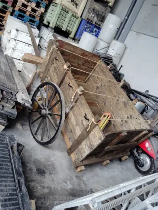 Carro de madera grande, ideal para dar un toque rústico a tu campo o jardín. Su diseño antiguo lo convierte en una pieza decorativa única. - Construcción robusta en madera. - Rueda de madera tradicional. - Estilo vintage.