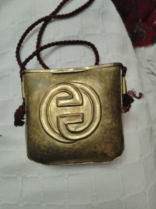 Bolso metálico de cobre con un diseño circular en relieve. Ideal para coleccionistas o como accesorio de época. - Material: Cobre - Diseño: Circular en relieve - Cierre: Pestillo metálico - Correa: Cordón trenzado