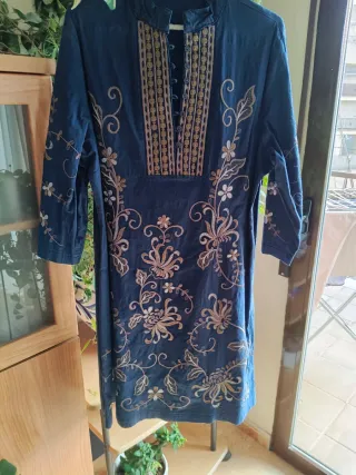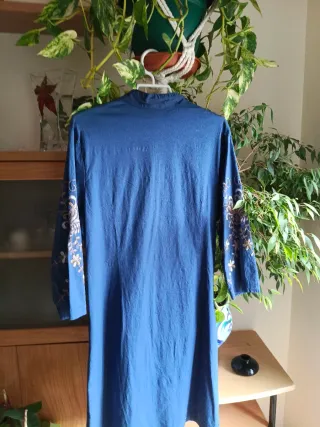 Vestido azul con bordados florales y detalles en hilo dorado. Es elástico y se encuentra en perfecto estado. - Cuello mao. - Cierre de botones en la parte delantera. - Mangas tres cuartos. - Diseño con bordados en toda la prenda.