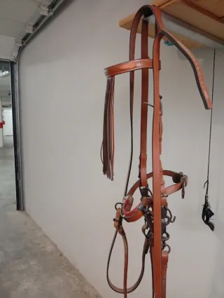 Cabezada de cuero para caballo, completamente nueva. - Material: Cuero de alta calidad. - Diseño clásico con flecos. - Hebillas metálicas ajustables.