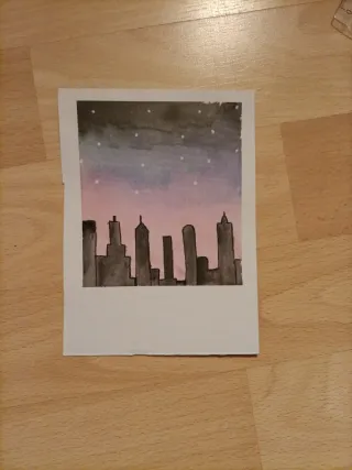Una hermosa pintura de acuarela que representa un skyline al atardecer. Obra original, no impresión. - Tonos degradados de rosa y morado en el cielo. - Siluetas de edificios en tonos oscuros. - Pequeñas estrellas blancas salpican el cielo nocturno. PUEDO REALIZAR BAJO ENCARGO ACUARELAS TANTO EN LIENZO COMO EN PAPEL. ESCRÍBEME AL CHAT.