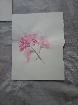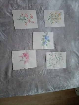 Conjunto de cinco delicadas acuarelas de motivos florales, perfectas para decorar o para amantes del arte. Obra original. - Pintura floral en tonos rosados y naranjas. - Acuarela de flores amarillas y verdes. - Pintura de hortensia azul. - Acuarela de flor rosa. - Pintura de flores rosadas y verdes. Posibilidad de comprar por tres euros cada una. PUEDO REALIZAR BAJO ENCARGO ACUARELAS TANTO EN LIENZO COMO EN PAPEL. ESCRÍBEME AL CHAT.