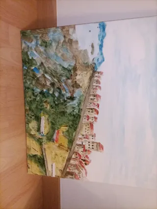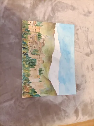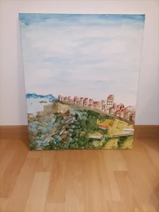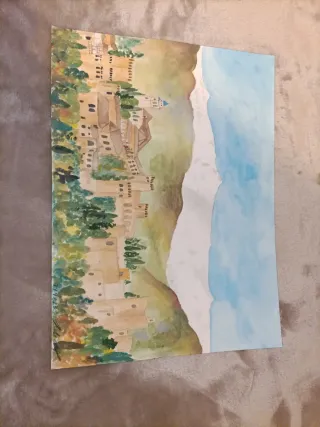 Acuarela original de un pintoresco pueblito costero. La obra captura la esencia de un paisaje marítimo con casas y acantilados. - Técnica: Acuarela. - Representación: Paisaje costero con edificaciones. Tamaño 60x50 PUEDO REALIZAR BAJO ENCARGO ACUARELAS TANTO EN LIENZO COMO EN PAPEL. ESCRÍBEME AL CHAT.
