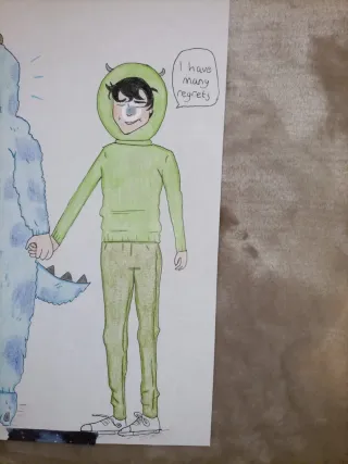 Dibujo original inspirado en Heartstopper. Representa a Charlie y Kit, uno vestido con un disfraz de monstruo azul y el otro con un atuendo verde. Tamaño a4 - Dibujo a mano alzada. - Colores vibrantes. - Incluye texto I have many regrets. PUEDO REALIZAR BAJO ENCARGO ACUARELAS TANTO EN LIENZO COMO EN PAPEL. ESCRÍBEME AL CHAT.