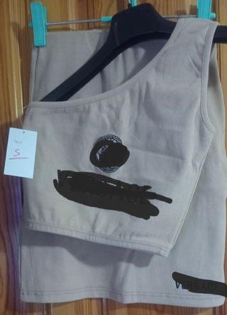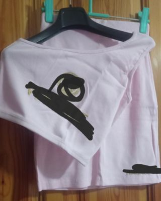 Conjunto de ropa de color rosa pálido, ideal para revender. - Camiseta sin mangas con detalle de logo. - Pantalón corto a juego. - Tejido acanalado.