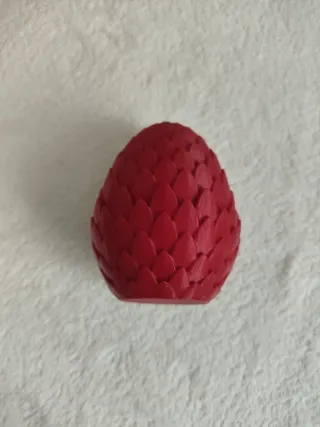 Este huevo impreso en 3D tiene un diseño escamoso y un color rojo vibrante. Su forma es ovalada y presenta una apertura fácil. - Color: Rojo - Diseño: Escamas - Material: Plástico impreso en 3D