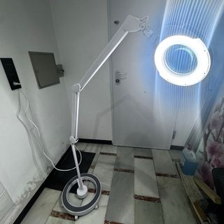 Lámpara de pie con brazo articulado y lupa incorporada. Ideal para tareas que requieren precisión. - Base estable con ruedas. - Altura ajustable. - Diseño moderno y funcional.