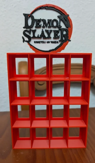 Exhibe a tu Cuerpo de Cazadores de Demonios con este expositor temático de Demon Slayer. Es el accesorio ideal para cualquier coleccionista del anime que busque una forma organizada y espectacular de mostrar sus figuras en miniatura. El diseño presenta el logo de Demon Slayer / Kimetsu no Yaiba y cuenta con una estructura de casillas que permite organizar perfectamente las figuras pequeñas. Realización mediante impresión 3D.