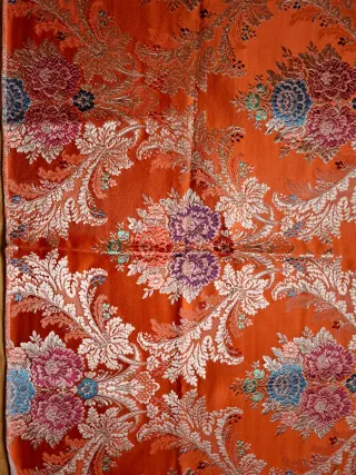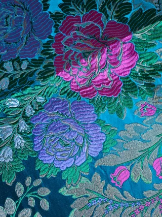 Tela fallera con un precioso bordado floral en tonos vibrantes sobre fondo azul turquesa. Ideal para confección de trajes regionales o decoración. - Material: Seda. - Medidas: 70 cm de ancho por 66 cm de largo. - Diseño: Motivos florales y hojas bordadas. Modelo H