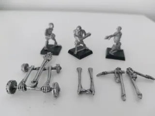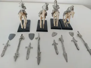 Figuras de Caballeros No Muertos para Warhammer Fantasy de metal originales. 4 lanzas, 4 espadas en funda, 2 escudos de metal y 2 escudos de plastico.