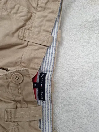 Pantalón de la marca Tommy Hilfiger en talla 14 años. Color beige, ideal para uso diario. - Cintura con cierre de botón y cremallera. - Bolsillos delanteros. - Logo de la marca en la parte trasera.