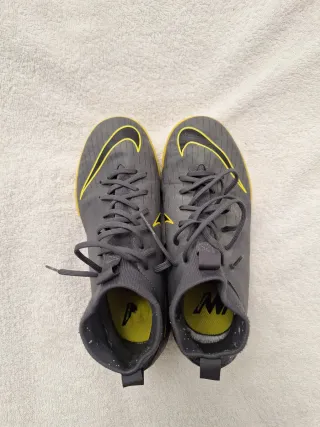 Zapatillas de fútbol sala Nike en talla 36. Diseñadas para un buen agarre y comodidad en la cancha. - Color gris con detalles en amarillo. - Cierre con cordones. - Diseño tipo calcetín para un ajuste ceñido.