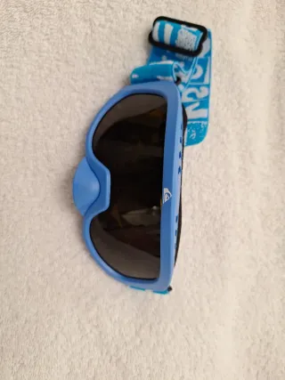 Gafas de esquí para bebé, adecuadas para aproximadamente 12 meses. El diseño es azul con detalles blancos en la cinta. - Montura azul. - Cinta con diseño a rayas.