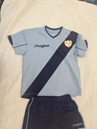 Conjunto deportivo del Rayo Vallecano. - Camiseta de manga corta. - Pantalón corto. - Logo de J'hayber en camiseta y pantalón. - Escudo del equipo en la camiseta.
