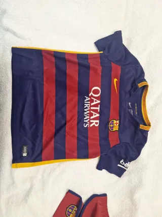 Conjunto de equipación del F.C. Barcelona para niños. - Camiseta a rayas azules y granates. - Pantalón corto a juego. - Logo de Qatar Airways en la camiseta. - Escudo del F.C. Barcelona.