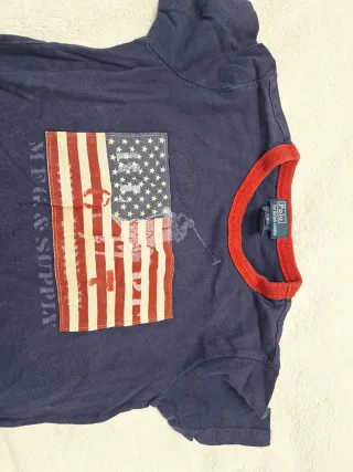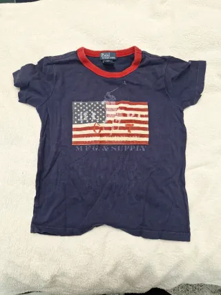 Camiseta azul de manga corta de Polo Ralph Lauren para niño de 3 años. Presenta un diseño con la bandera de Estados Unidos y el logo de la marca. - Color: Azul marino - Talla: 3 años - Estilo: Estampado bandera USA