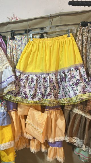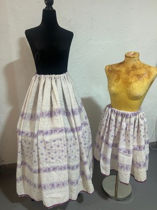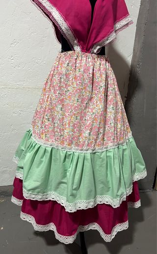faldas de estilo huertano, ideales para trajes regionales o eventos especiales. - Diseño con estampado floral en tonos verdes y rosados. - Detalle de encaje en la unión de las telas. - Volante inferior en color verde menta. - Ribete decorativo en zigzag