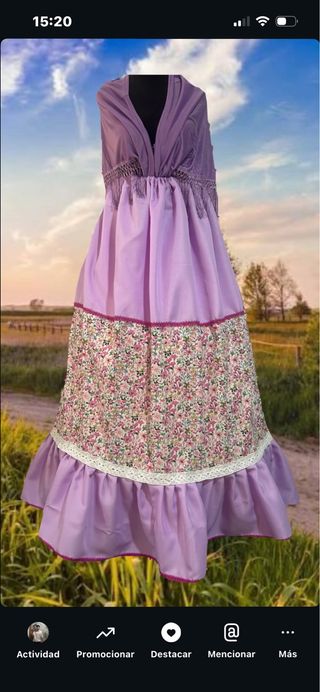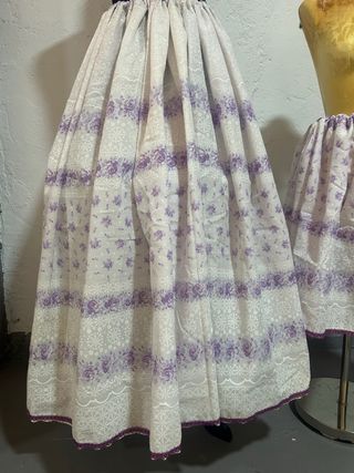 Zagalejo con un bonito estampado floral en tonos morados y blancos. Presenta varias franjas decorativas con motivos florales y de encaje. - Diseño con flores moradas. - Detalle de encaje en el borde inferior. - Tejido ligero y vaporoso.