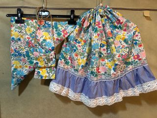 Zagalejo de estilo tradicional con delantal y bolsita a juego. - Tejido principal con estampado floral. - Detalle de puntilla en el borde del delantal y la falda. - Volante inferior con estampado floral. - Bolsita a juego con puntilla.