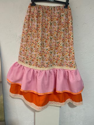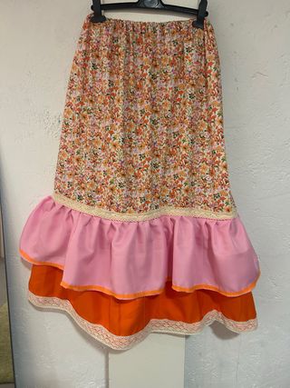 Falda larga con un bonito estampado floral y volantes. - Estampado floral en tonos naranjas y rosas. - Volantes en color rosa y naranja. - Detalle de encaje en los volantes.