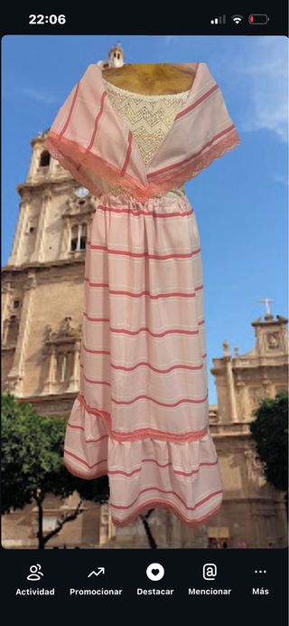 Conjunto tradicional de zagalejo y pico. - Zagalejo de tela rosa con rayas finas y encaje. - Pico a juego con detalles de encaje y rayas.