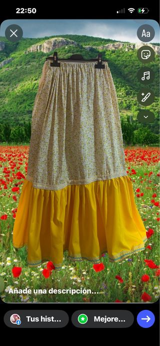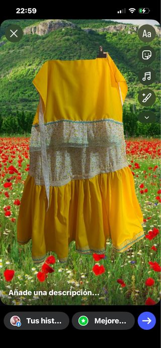Falda huertana de estilo zagalejo con un bonito estampado floral en tonos amarillos y naranjas. Presenta un volante en el bajo con un ribete amarillo. - Diseño floral. - Volante en el bajo con ribete.
