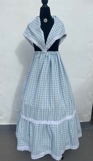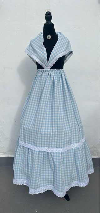 Conjunto de zagalejo y pico con estampado de cuadros. - Diseño de cuadros vichy en tonos azul y blanco. - Pico con cuello amplio. - Zagalejo largo con volantes y encaje. - Adorno de encaje en los bajos del zagalejo.