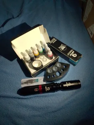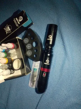 Máquina de tatuar Dofart, ergonómica y ligera y tinta de colores y negra también y una unida de aguja usada dos veces - Cómodo agarre. - Pantalla de escala. - Agarre antideslizante. - Conexión RCA Jack. - pack de tinta negra y colores. - 1 aguja para la máquina. - rollo cinta antideslizante