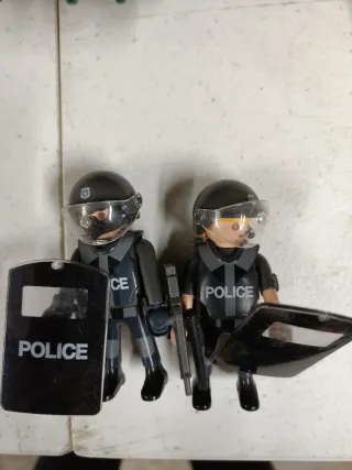 Set de dos figuras de Playmobil de la unidad de policía antidisturbios. - Incluye cascos con visera. - Chalecos tácticos con POLICE serigrafiado. - Escudos protectores. - Armas y accesorios.