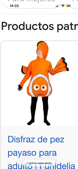 Un disfraz de pez payaso inspirado en Nemo. Talla adulto. Perfecto para fiestas temáticas o Carnaval.