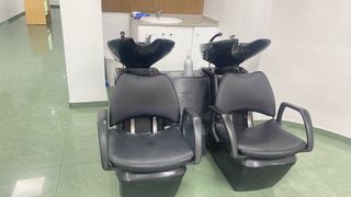 Lavacabezas doble para salón de peluquería con sus dos sillones. 4 sillones hidráulicos para tocador de peluquería , dos son manuales y dos a pie. 4 reposapiés. 2 sillas para la sala de espera. - Diseño moderno y funcional. - Materiales de alta calidad. - Tapicería nueva , menos de un año.