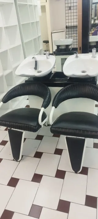 Conjunto de 2 lavacabezas negros para peluquería. Diseñados para ofrecer comodidad y funcionalidad. Los 175€ uno 100€ Otro 75 Hay uno que no se levanta pero tiene arreglo. - Asientos acolchados de cuero sintético. - Bowls de cerámica negra. - Brazos cromados.