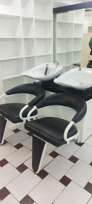 Conjunto de lavacabezas para salón de peluquería. Diseñados para ofrecer comodidad y funcionalidad. - Dos lavacabezas. - Sillas tapizadas en negro y blanco. - Estructura blanca. Se encuentran en San Lorenzo de el Escorial...se desmontan y cargan por la persona que lo compre