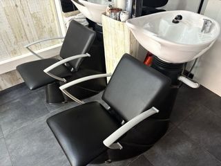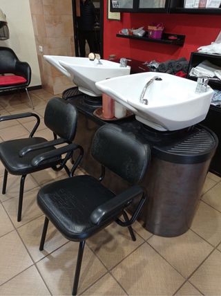 lavacabezas doble con dos sillas negras. Están bastante usados. Pero funcionan perfectamente.