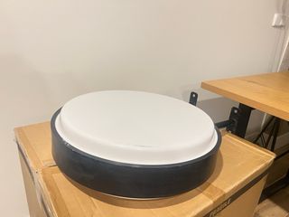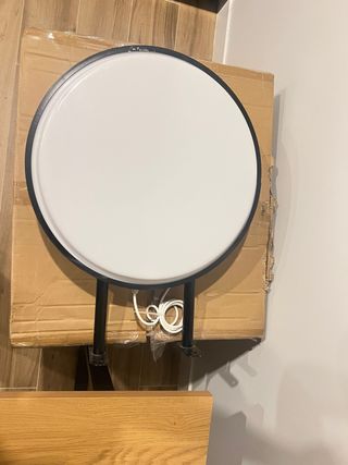 Rótulo circular con marco negro y panel blanco. - Ideal para logos o señalización. - Estructura metálica. - Incluye cableado. 48cm x 48cm