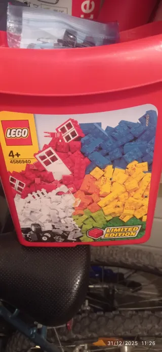 Lote de construcción LEGO con el número de referencia 4586940. Incluye varias piezas y figuras para crear diferentes modelos. - Contiene un camión azul, una grúa amarilla y un barco. - Incluye figuras de LEGO. - Caja de almacenamiento roja. Una pala de playa y unos rotuladores de colores q dibujan siluetas