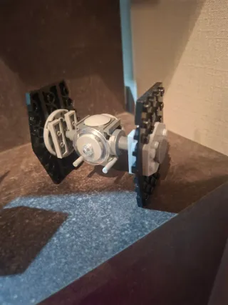 Mini caza TIE construido con piezas de Lego. - Diseño icónico de Star Wars. - Construcción detallada con piezas grises y negras.
